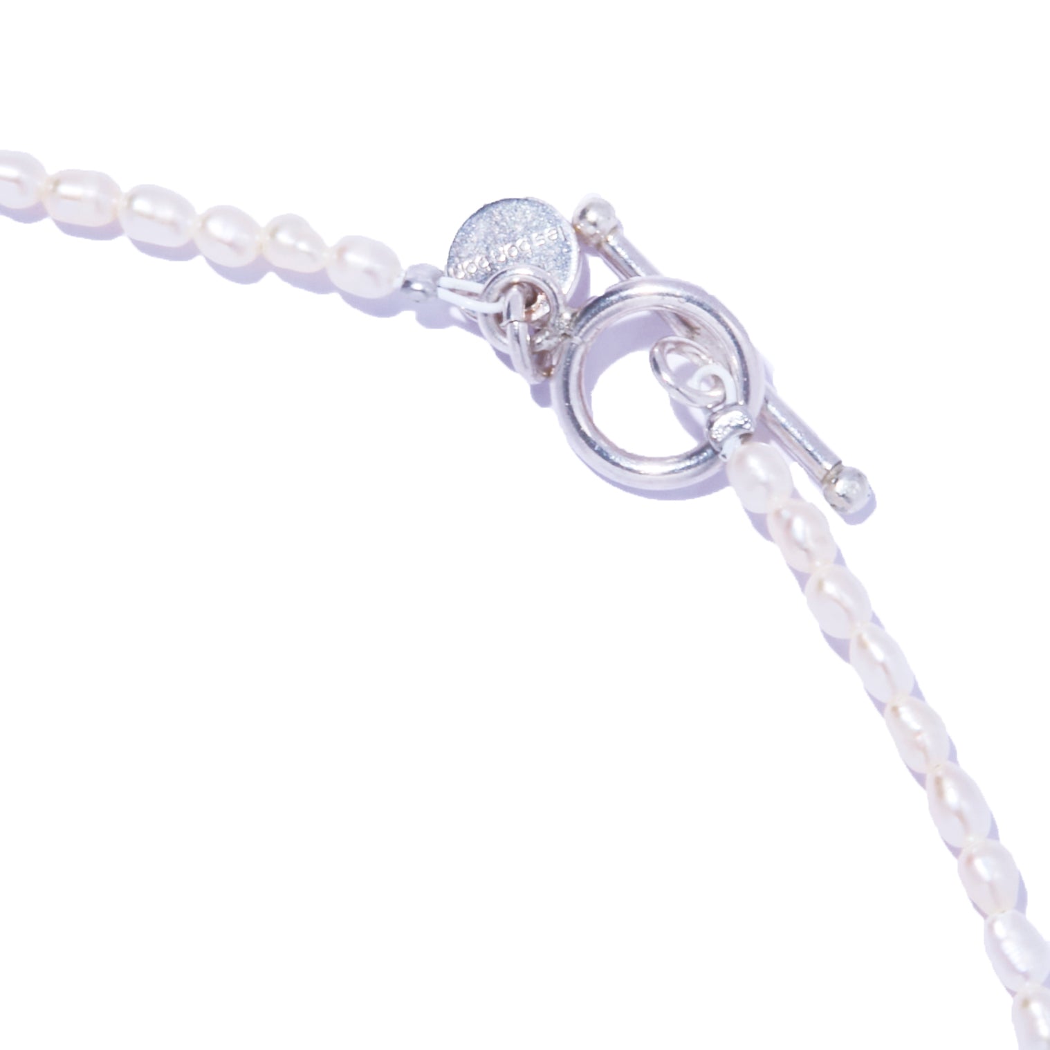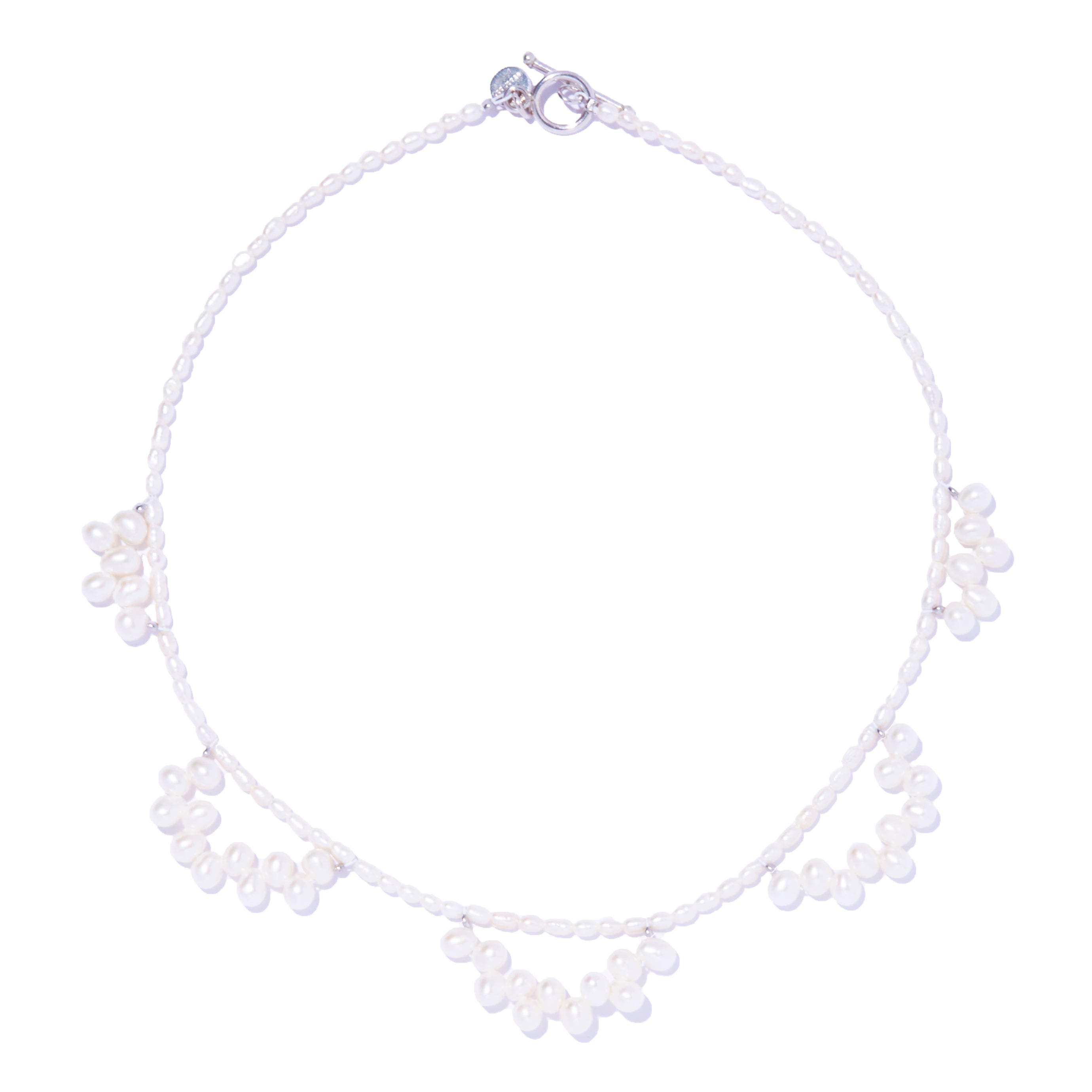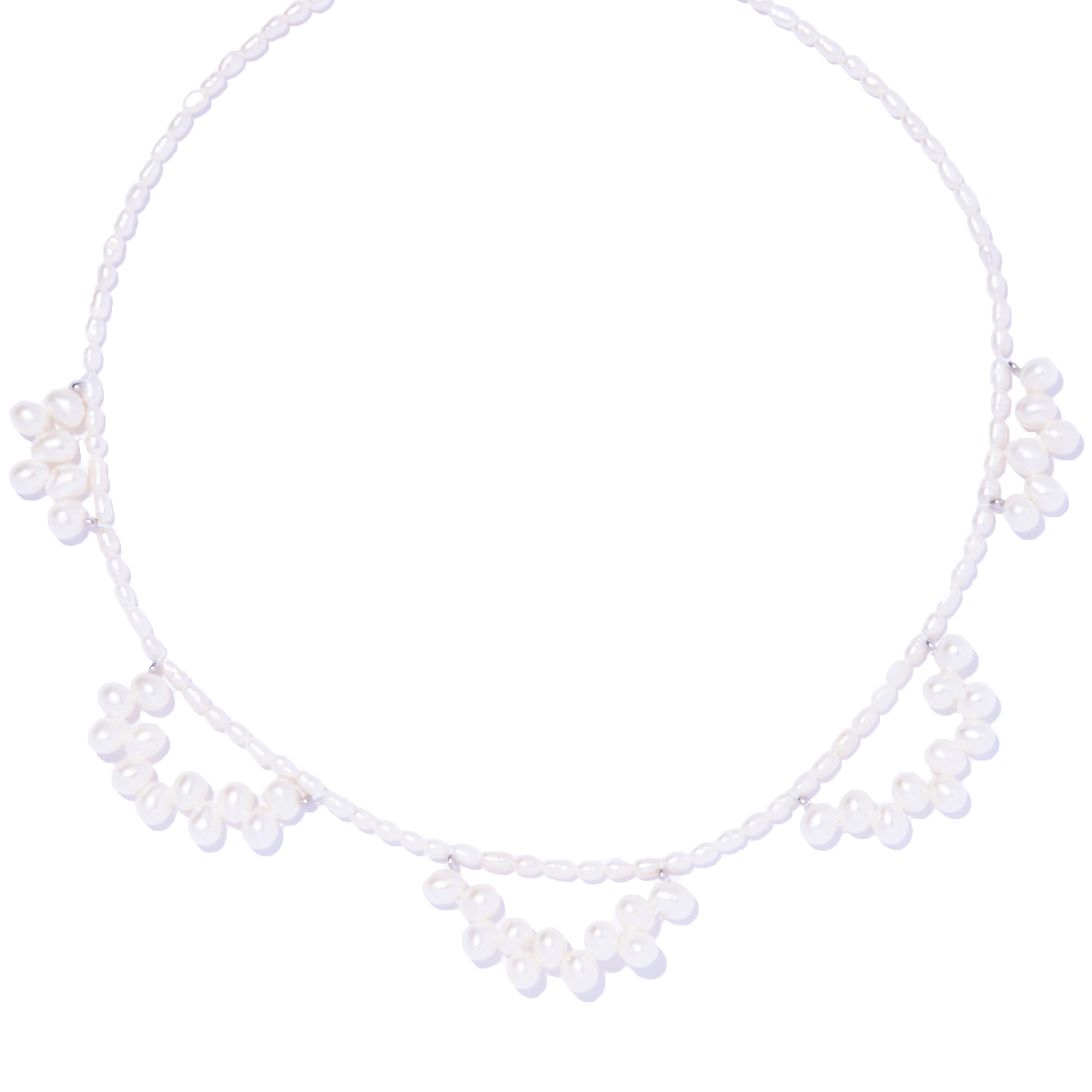 静けさのある淡水パールを躍動的に並べることで、フェミニンさとモダンさが共存したスタイルに。