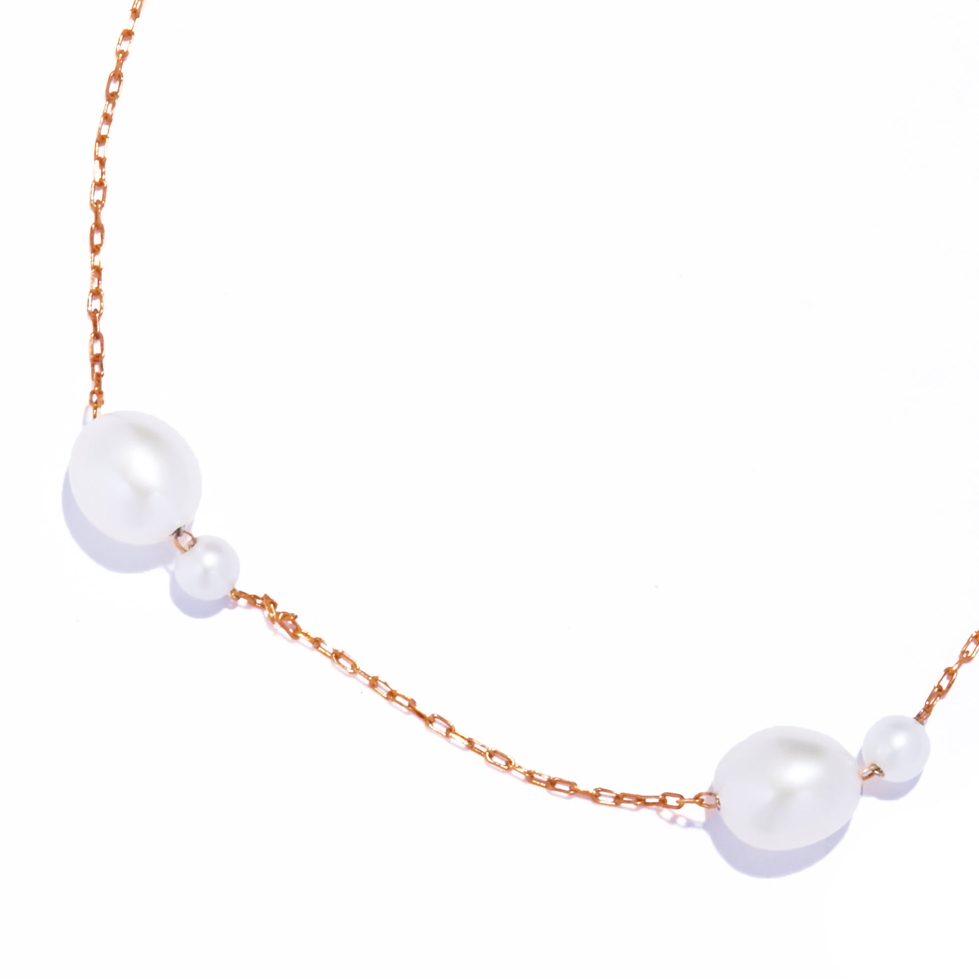 淡水パールとK10チェーンが継ぎ目なく溶け合い、視線の途切れない一本のラインを描きます。