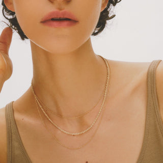 金の糸を撚り合わせたような立体感のあるフォルムのチェーンは、マットな質感に浮かび上がるような凸面の輝きが特徴。