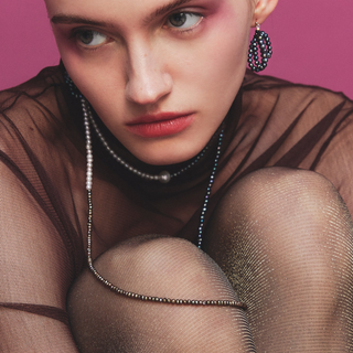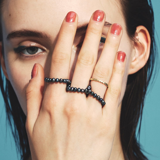 コントラストの効いた配色がクールな印象を与えつつ、中央に配した大ぶりのパールからはフェミニンな色香も漂います。