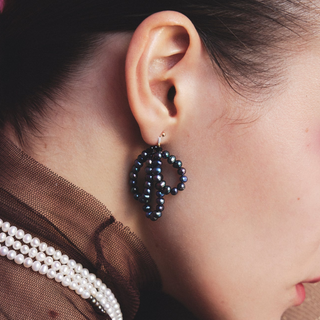 濃厚で奥行きのあるネイビーが、白いパールの透明感を引き立て、クリーンで知的な顔周りを演出。