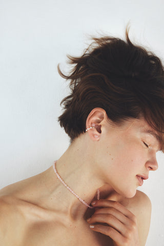淡水パールとローズクォーツのピュアな艶めきに対して、ピンクの淡水パールが生命感と力強さを感じさせます。