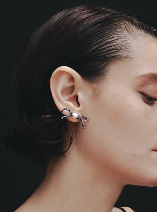 リボンのあしらいも、メタリックシルバーの光を放つストーンとの組み合わせなら、強さを感じるクールな印象。