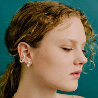 ゴールドチェーンは程よく密度があり、しっとりと肌に吸い付くような曲線を描きます。照りのあるパールと合わさることで存在感のある佇まいに仕上がりました。