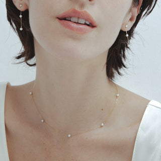 3mmの淡水パールによるたおやかな揺れによって上品さが増し、ブルゾンやジャケットなど辛口なアイテムに女性らしさをもたらします。