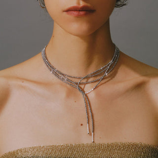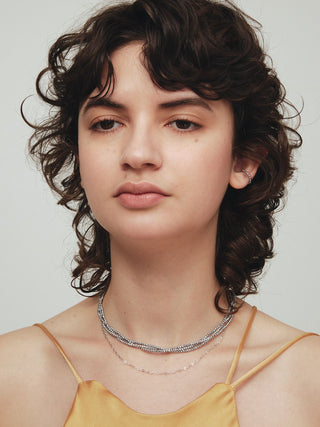 メタリックな光沢感を首にフィットさせてつけることで生まれる“洗練感”と“モード感”を放つヘマタイトチョーカー。