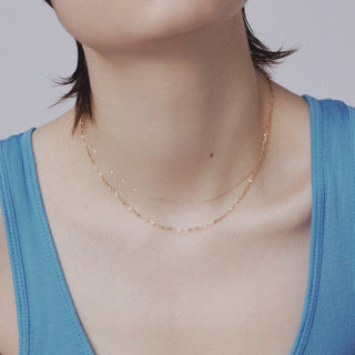 繊細なカットが施されたコマが連なるチェーンは、光を受けて美しく華やかに輝き、肌を明るく見せます。抜けのあるチェーンのディテールが、軽やかな存在感で涼し気な手元の印象に。