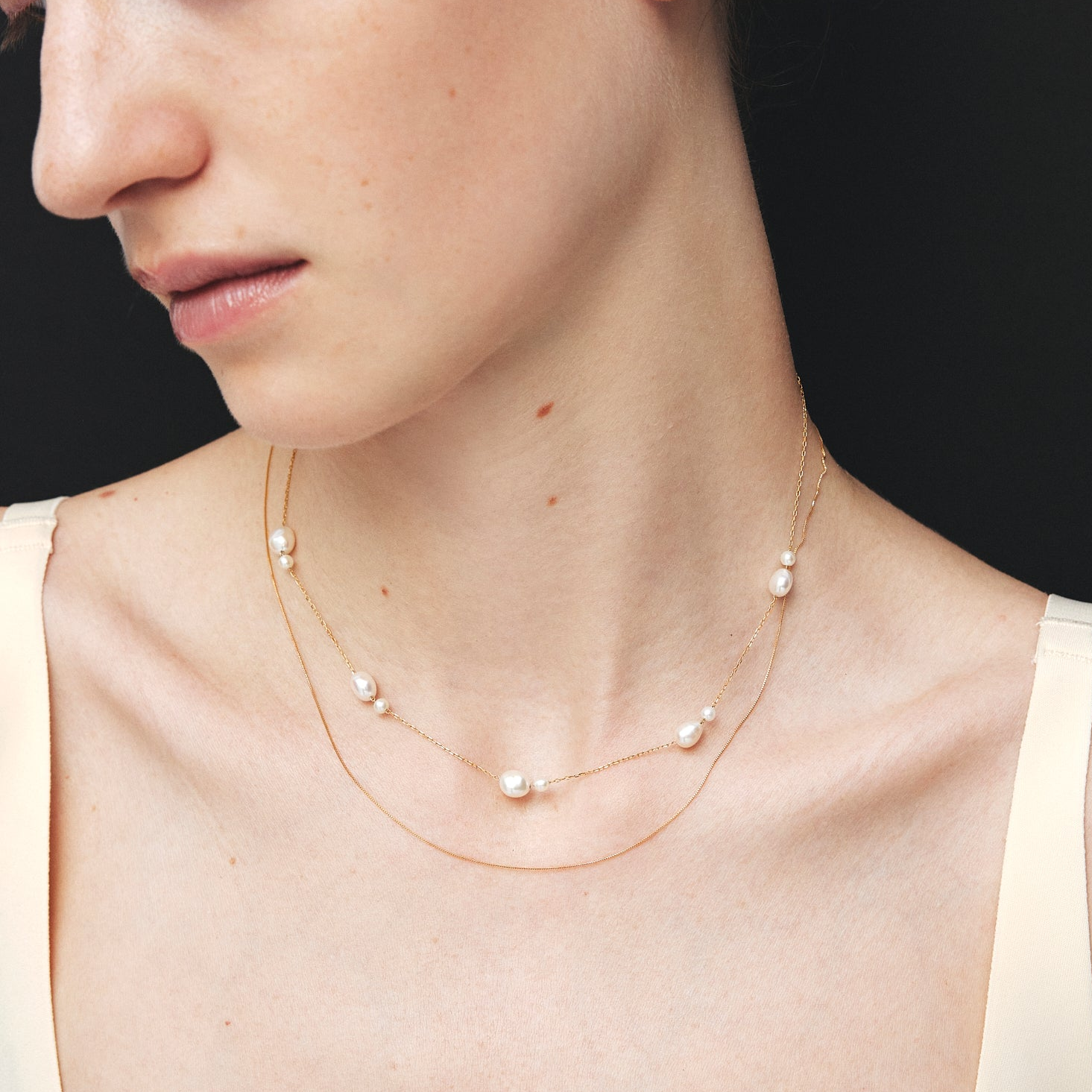 淡水パールとK10チェーンが継ぎ目なく溶け合い、視線の途切れない一本のラインを描きます。