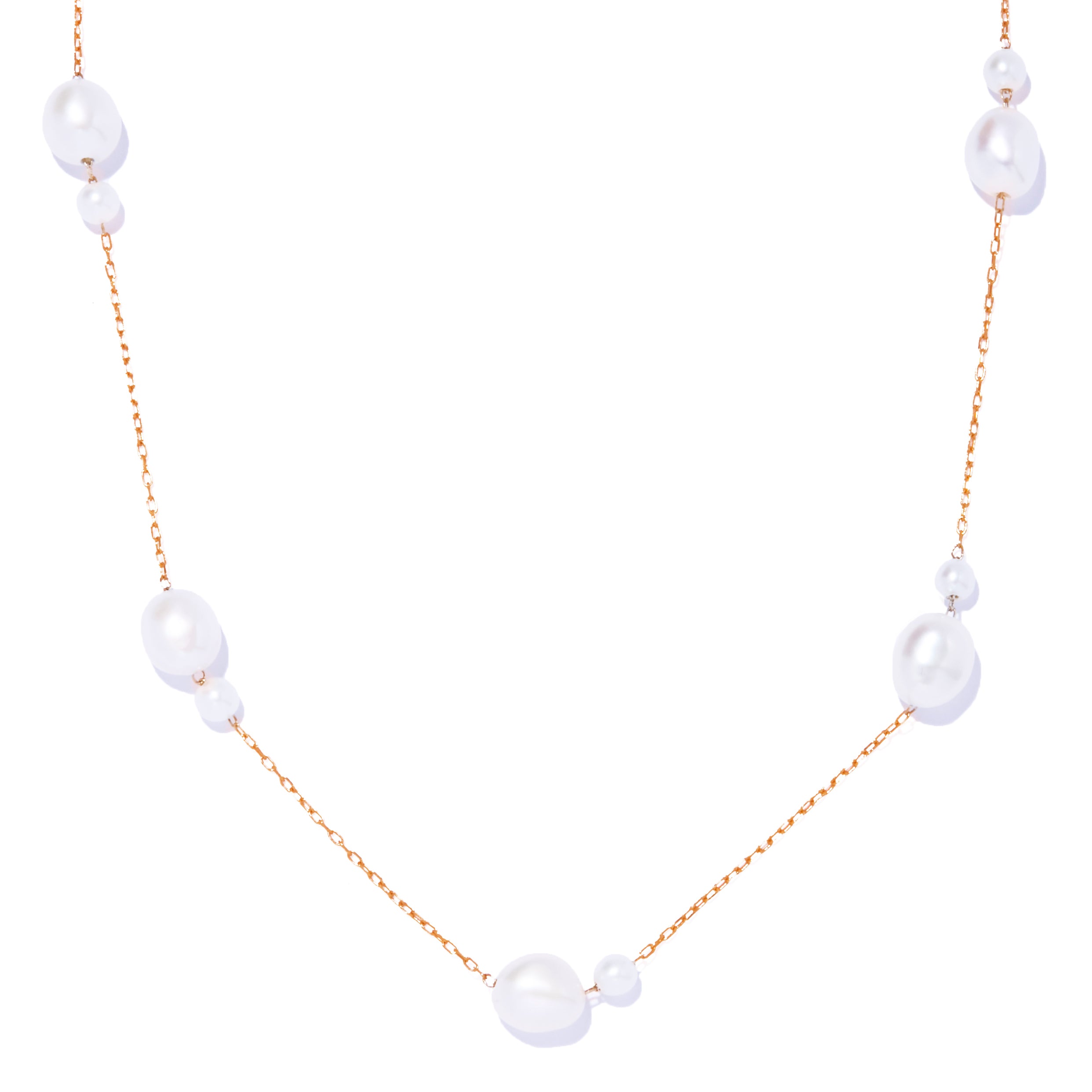 淡水パールとK10チェーンが継ぎ目なく溶け合い、視線の途切れない一本のラインを描きます。
